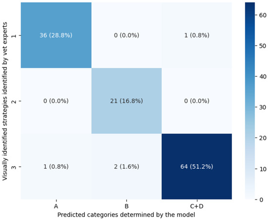 39]. Although k-means clustering is an unsupervised machine learning technique, it provided an opportunity to explore different cluster numbers and thresholds. Initially, without prior knowledge, we applied a single k-means clustering with three clusters to identify strategies. While this approach provided some insights, it resulted in an overall accuracy of 77.6%, with 26 errors (20.8%), particularly between strategy S3 and category CatB. Additionally, there were minor misclassifications, such as incorrectly labeling strategy S1 as CatC or CatD (four-beat strategy), which were inconsistent with expected patterns. To improve the classification, we then implemented two successive k-means clusterings, each with two clusters. This refined approach yielded more consistent results for most laps, achieving an overall accuracy of 80.0%, with 24 errors (19.2%), again mainly between strategy S3 and category CatB. Encouragingly, both methods produced three clusters that corresponded to the strategies identified by the veterinarian team. However, the frequent mislabeling between strategy S3 and CatB led to the consideration of a fourth category. Acknowledging potential variations within the four-beat strategy, the second k-means clustering applied three clusters to establish quantitative thresholds, successfully revealing two distinct variations of the four-beat strategy. In doing so, the machine learning algorithm enhanced the qualitative observations made by the veterinarian team, providing quantitative insights that extended beyond visual identification. In our study, machine learning primarily served as a powerful tool to derive complex quantitative results in our study. A key strength of our approach was the iterative comparison and validation of findings with the observations of the veterinarian team. This iterative process is essential in studies employing machine learning algorithms, as it helps to bridge computational challenges with expert insights. However, as shown by our initial attempt using a single k-means clustering with three clusters, the application of machine learning to formulate hypotheses in medical or veterinary fields must be undertaken with caution [