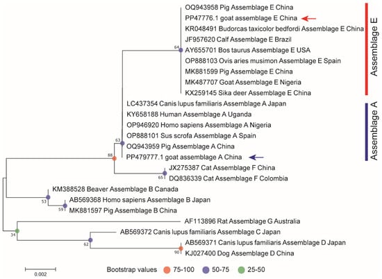Assemblages C and D, for example, have been found in domestic dogs and other canines. Assemblage F predominantly infects cats. Assemblage H primarily affects wild animals [7,8,9,10,11,12]. Notably, assemblage E is the most frequently detected in goats worldwide, followed by assemblages A and B [13].