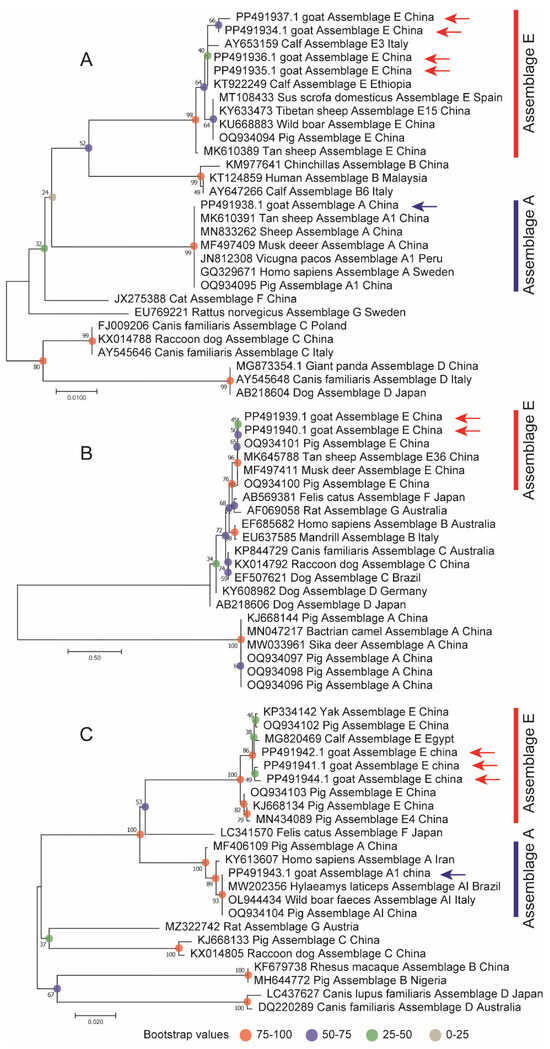 DNA sequences from the bg, gdh, and tpi loci were subsequently obtained and submitted to the GenBank database. Specifically, five sequences representing the bg locus were obtained from the 35 bg-positive samples (IDs: PP491934-PP491938), two sequences from the 24 gdh-positive samples (IDs: PP491939-PP491940), and four sequences from the 27 tpi-positive samples (IDs: PP491941-PP491944). Phylogenetic analysis was performed using Clustal W alignment and the maximum likelihood (ML) method to construct evolutionary trees for the bg, gdh, and tpi loci (Figure 3). The results indicate that the detected assemblage E consistently clusters with the reported assemblage E, showing a close relationship with assemblage E found in both cattle and goats. Notably, the detection of assemblage A in the bg genotype and assemblage A1 in the tpi genotype aligns with prior studies that suggest assemblage A1 is predominantly found in animals.