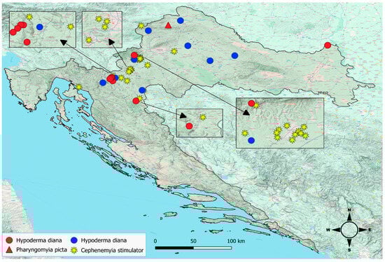 Much less is known about the botfly species responsible for myiasis among domestic and wild ruminants in southeastern Europe. Croatia is a good area to examine this question because it contains continental and Mediterranean regions suitable for various oestrid fly species and their wild cervid hosts, particularly roe deer and red deer, which are the most common wild cervid hosts in other parts of Europe [13,14,15]. Studies based solely on morphology have reported Cephenemyia stimulator, C. ulrichii, and P. picta in roe deer and red deer in Croatia [16,17], and one such study reported a 12% prevalence of C. stimulator in roe deer in one part of the country [18]. Those studies did not cover most of the country, nor did they validate their species identification using molecular techniques. The present study therefore undertook the morphological and molecular characterization of botflies linked to subcutaneous and nasopharyngeal myiasis in roe deer and red deer across Croatia.