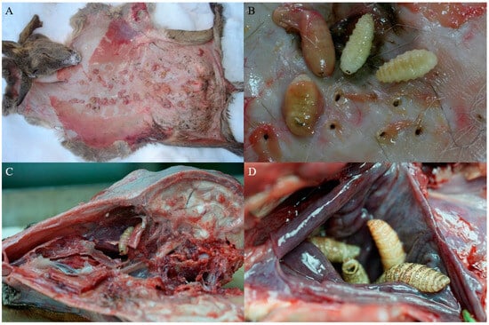 Examples of macroscopic findings in a roe deer. (A) Subcutaneous warbles. (B) Larvae of Hypoderma sp. extracted from subcutaneous warbles. (C,D) Larvae of Cephenemyia sp. in the pharyngeal pouch.