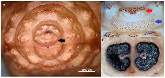 Representative third-instar larva of Hypoderma diana. (A) Anterior end showing the mouth (m), opercular suture (os) and band of spines between mouth and opercular suture (black arrow) on the cephalic segment. (B) Ventral spines on the first thoracic segment showing posteriorly directed spines with narrow bases and rounded tips (red arrow) and anteriorly directed spines with narrow bases and sharp tips (blue arrow). (C) Flat, C-shaped spiracular plates incompletely surrounding an ecdysal scar (es).