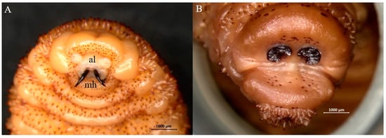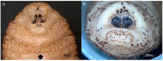 Representative third-instar larva of Cephenemyia stimulator. (A) Anterior end with V shaped antennal lobes (al), mouth hooks (mh) and arrays of cuticular spines (arrow). (B) Posterior end with reniform spiracular plates.