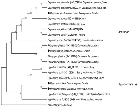Maximum-likelihood phylogenetic tree based on cox1 nucleotide sequences of species in subfamilies Osterinae and Hypodermatinae. The strains identified in the present study are indicated with a solid circle. Previously reported strains of H. diana, H. tarandi and H. actaeon were not included because the corresponding sequences in the database come from different regions of the cox1 gene than the region sequenced in the present study.