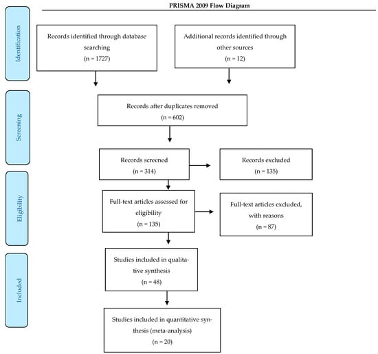 The results were categorized based on searches across indexing databases, yielding a total of 1.727 articles (Figure 1). The review process began by removing duplicates, resulting in 314 studies for further evaluation. An additional search through the references cited in these studies identified 12 new articles. Following an abstract screening, 135 studies were excluded. The remaining 48 studies underwent full review, and 20 met the established selection criteria. The 28 excluded studies lacked results presented as means and standard deviations, which precluded their inclusion in the meta-analysis.