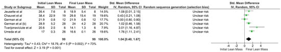 Meta-analysis of the association between the initial and final lean mass of obese dogs and metabolizable energy concentrations (<3.275 kcal). Mean: media. SD: mean, standard deviation of the mean. Total: number of animals in the sample. Weight: represented as a percentage and indicates the influence of the study on the overall result (Chauvet et al., 2011 []; German et al., 2007 []; German et al., 2010 []; Jeusette et al., 2005 []; Tvarijonaviciute et al., 2013 []; Umeda et al., 2006 []).