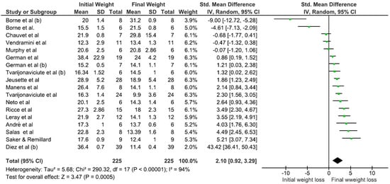 An additional limitation of this meta-analysis relates to the composition of diets used in the experimental protocols. Among the 21 articles included, five (Table S2) featured nutraceutical compounds (such as L-carnitine, omega-3, and prebiotics), which may provide supplementary benefits by enhancing weight loss or promoting lean mass gain. Similar effects may arise from individual characteristics such as age, sex, reproductive status, and breed (Table S3). Younger animals, intact males, and those with higher metabolic rates can significantly influence weight and body composition, representing another limitation of this study. To account for these variables, we incorporated them into the statistical analysis for both evaluated groups, ensuring that any potential effects on the measured variables were consistently reflected across groups.