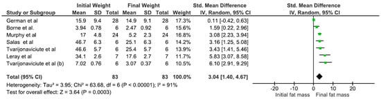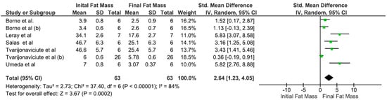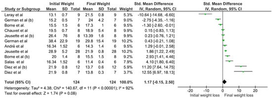 Meta-analysis of the association between the initial and final fat masses of obese dogs and total dietary fiber concentration (<12%). Mean: media. SD: mean, standard deviation of the mean. Total: number of animals in the sample. Weight: represented as a percentage and indicates the influence of the study on the overall result (Borne et al., 1996 []; Leray et al., 2008 []; Salas et al., 2018 []; Tvarijonaviciute et al., 2013 []; Tvarijonaviciute et al., 2012 []; Umeda et al., 2006 []).