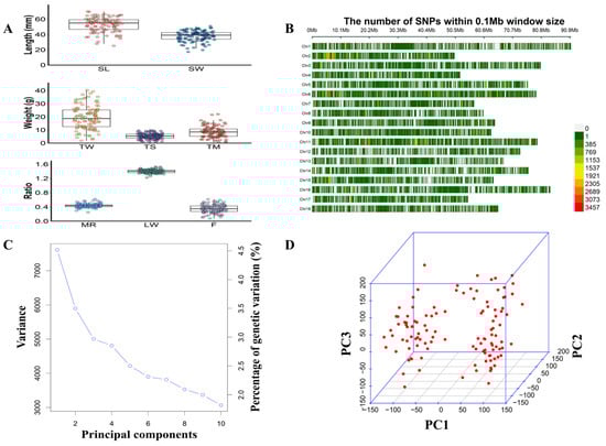 Growth-related traits and genetic variants distribution of individuals used for GWAS. (A) Box plots of eight growth-related traits of 115 individuals of three-way cross hybrid abalone (DF × SS). (B) Distribution of SNPs on each chromosome (the number of SNPs within a 0.1 Mb window size). (C) The gravel plot in principal component analysis (PCA). (D) 3D PCA plot.