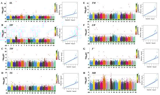 Manhattan plots and QQ plots of (A) SL, (B) SW, (C) TW, (D) TS, (E) TM, (F) LW, (G) F, and (H) MR. The black line represents the genome-wide significance threshold (−log10P = 5). The horizontal bars represent marker density on each chromosome. SL: shell length; SW: shell width; TW: total weight; TS: shell weight; TM: foot muscle weight; LW: the ratio of shell length and shell width; MR: the ratio of foot muscle weight and wet weight; F: the ratio of wet weight and shell length.
