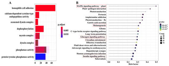 A total of 3665 differentially expressed genes were identified between the L group and S groups. Of these, 705 genes were up-regulated and 2960 genes were down-regulated in the L group relative to the S group (Figure 3C). These DEGs were enriched in eight GO terms, including homophilic cell adhesion, axonemal dynein complex, calcium-dependent cysteine-type endopeptidase activity, dephosphorylation, myosin complex, dynein complex, phosphatase activity, and protein tyrosine phosphatase activity (Figure 4A). The KEGG pathway enrichment analysis showed that 3665 DEGs in the two groups were enriched in the MAPK signaling pathway (35 genes), circadian entrainment (49 genes), glucagon signaling pathway (47 genes), melanogenesis (43 genes), and the insulin signaling pathway (64 genes) (Figure 4B).