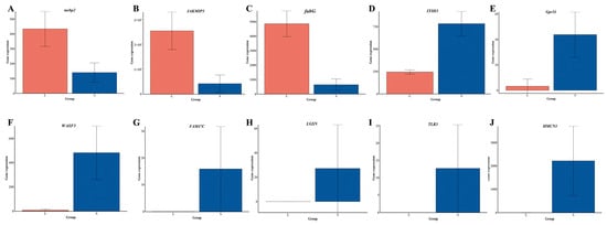 A total of ten overlap genes were found between GWAS results and DEGs in transcriptome analysis (Table 1 and Figure 3D). Among them, three genes were up-regulated in large individuals of DF × SS, including 3-oxoacyl-[acyl-carrier-protein] reductase FabG (fabG), RISC-loading complex subunit tarbp2 (tarbp2), and janus kinase and microtubule-interacting protein 3 (JAKMIP3). However, seven genes were down-regulated in large individuals of DF × SS, including hemicentin-1 (HMCN1), lengsin (LGSN), Wiskott–Aldrich syndrome protein family member 3 (WASF3), putative protein FAM47C (FAM47C), toll-like receptor 3 (TLR3), probable G-protein coupled receptor 34 (Gpr34), and inter-alpha-trypsin inhibitor heavy chain H3 (ITIH3). The sequences of the ten overlap genes are shown in Table S6. Expression of ten overlap candidate genes by RNA-seq in the L and S groups is shown in Figure 5. There was a significant difference in the expression of these candidate genes in the L and S groups. This suggests that these candidate genes may play an important role in the growth traits of the three-way cross hybrid abalone.