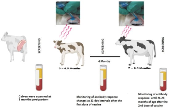 The study was carried out on a dairy farm in Konya, Turkey (37°52′ N, 32°29′ E) between December 2021 and December 2023. This Brucellosis-free farm, which has 3100 Brown Swiss and Simmental cattle, was screened for Brucellosis, and all were found negative. Calves born between August and October 2021, aged 3 months, were screened for Brucellosis during the pre-vaccination period (after maternal antibody levels had decreased). One hundred fifteen calves aged between 3 and 4.5 months were vaccinated by dividing them into five groups according to the study groups below. In the vaccine groups with two dose applications, the second dose of vaccine was administered 4 months after the first dose of vaccine (aged 7–8.5 months) (Figure 1). The study was conducted in collaboration with three GMP-certified organizations in Turkey that produce Brucella vaccines, one state-owned and the other two private-sector [20]. Vaccines belonging to the vaccine companies used in the study were numbered A, B, and C due to ethical concerns (Table 1). Since the study aimed to monitor antibody levels of different Brucella vaccinations, which is mandatory by regulation, an unvaccinated group was not added. Vaccination groups were organized according to the vaccines and vaccination routes allowed by the regulations in the field.