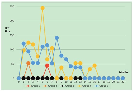 In group 4, It was determined that the CFT titer reached 1000 and SAT titer 1/320 in the fifth month. It was determined that the titer of this animal, whose CFT titer reached 1000, turned negative in the eighth month, like all other animals in the group, but started to increase by following a fluctuating course from the 11th month. The titer dropped below 30 in the 17th month and remained at 9.3 until the end of the study. In group 5, CFT titers dropped below 30 in the 14th month, and the entire group population was negative in the 19th month. It was found that titers fluctuated and persisted in this manner in 5% of the population in group 4. In group 5, the percentage of animals with fluctuating long-term antibody titers in the population was determined as 8.7%.
