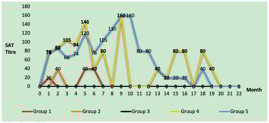 According to the SAT results, animals in group 1 and group 2 had a titer of 1/40, but no animal in group 3 ever reached this titer. In these three vaccine groups, antibody titers were observed to decrease rapidly within 4 months after the first vaccine dose until the booster dose. In group 4, some animals had positive titers in the CF test for up to 17 months and the SA test for up to 20 months after the application. Group 5 had 30 ICFTU titers up to 14 months after application and 1/40 titers up to 19 months in the SAT (Figure 3). The number of SAT-positive animals in the first month was 21 in groups 4 and 5. This number decreased by 85.7% to 3 in group 4 and by 71.4% to 6 in group 5 in the fourth month. In group 4, three different animals with SAT titers of 1/160 and above were found in the fourth month. In group 5, five animals with a titer of 1/160 were detected up to the 10th month, and 1/320 SAT titer was detected in different animals in the fourth, eighth, and ninth months (Table 4).