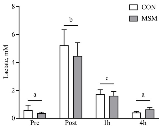 Blood lactate response following a submaximal SET test. Blood lactate increases at 10 min post-exercise, followed by a decline to baseline by 4 h following a submaximal SET test. MSM treatment did not affect blood lactate prior to or following exercise. Means and SEMs are shown. Different letters indicate significance at p < 0.05.