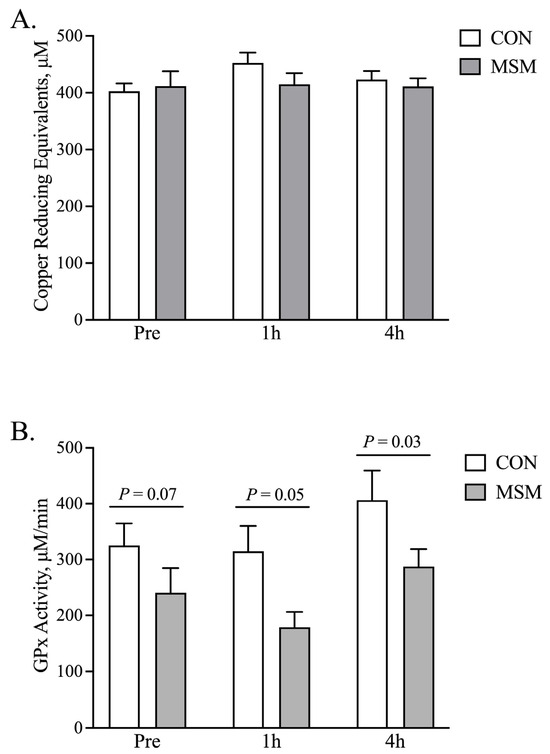 Plasma isolated from the MSM and CON horses was examined for total antioxidant capacity (TAC). Neither time nor dietary MSM altered TAC’s activity (Figure 2A). By contrast, both diet (p < 0.05) and time (p < 0.08) altered glutathione peroxidase’s (GPx) activity; no diet-by-time interaction was noted. The addition of MSM to the diet caused a reduction (p < 0.05) in glutathione peroxidase (GPx) activity by comparison to the CON at 1 h and 4 h post-SET with a tendency for lower activity (p < 0.07) prior to exercise (Figure 2B).