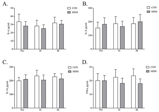 The ability of MSM to function as an anti-inflammatory was assessed by measurement of the plasma cytokine concentrations before (t = 0), 1 h, and 4 h after the SET. Bead-based immunoassays revealed neither treatment (MSM) nor time post-exercise altered the concentrations of IL6, IL8, IL10, or TNFα (Figure 3A–D).