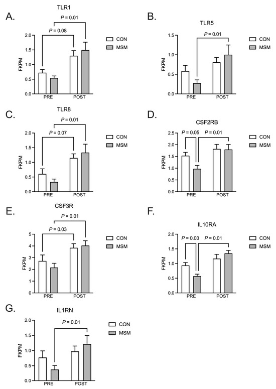 Select receptor genes involved in Toll-like receptor, interferon, and interleukin signaling pathways, which were modified with MSM supplementation. Reactome pathway query indicated that within DEGS from MSM-supplemented horses, there was an over-representation of immune response and cytokine signaling pathways. Select receptor genes from these specific pathways were selected for visualization. TLR1 (A), TLR5 (B), TLR8 (C), CSF2RB (D), CSF3R (E), IL10RA (F), and IL1RN (G) were all upregulated following exercise in MSM-supplemented horses. CSF2RB and IL10RA expression was modified between MSM and CON-supplemented horses prior to exercise (D,F).