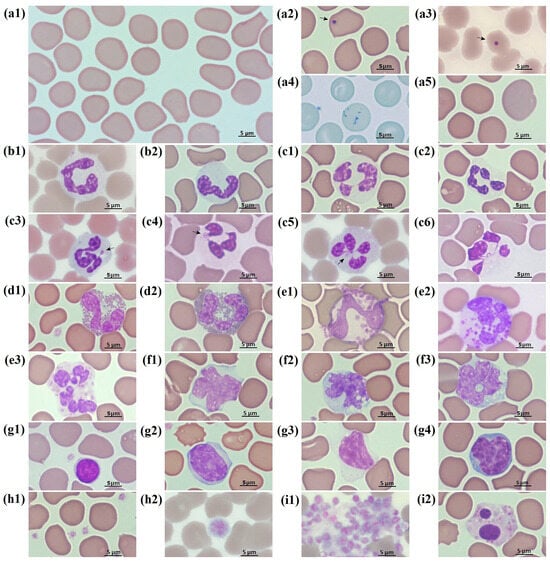 The morphology of peripheral blood cells of the Baikal seal (Phoca sibirica). (a1) Mature red blood cells; (a2,a3) mature erythrocyte with Howell–Jolly body (arrow); (a4) reticulocyte (cresyl diamond blue); (a5) polychromatophil; (b1,b2) band neutrophils; (c1) segmented neutrophil with 3 nucleus lobes connected by thin filaments of nucleoplasm sequentially; (c2) hypersegmented neutrophil with 5 nucleus lobes connected by sequential thin nuclear filaments; (c3) segmented neutrophil with Barr body (arrow); (c4) segmented neutrophil with 3 nuclear lobes connected by sequential thin nuclear filaments and nuclear vesicular appendages (blebs) (arrow); (c5) segmented neutrophil with 4 nuclear lobes connected by thin nuclear filaments from a central point and nuclear vesicular appendages (blebs) (arrow); (c6) hypersegmented neutrophil with 5 nuclear lobes connected by thin nuclear filaments; (d1,d2) eosinophils; (e1–e3) basophils; (f1–f3) monocytes with variable morphology; (g1) small lymphocyte; (g2) large lymphocyte; (g3) large lymphocyte; (g4) reactive (activated lymphocyte); (h1) platelets; (h2) large platelet; (i1) platelet aggregation (artifact); (i2) pyknosis of neutrophil nucleus in a fresh sample (presumed artifact). Romanowsky–Giemsa staining (unless otherwise noted); objective magnification ×100.