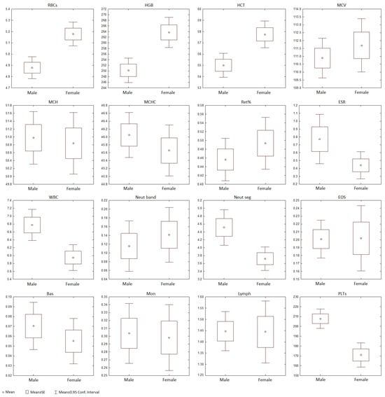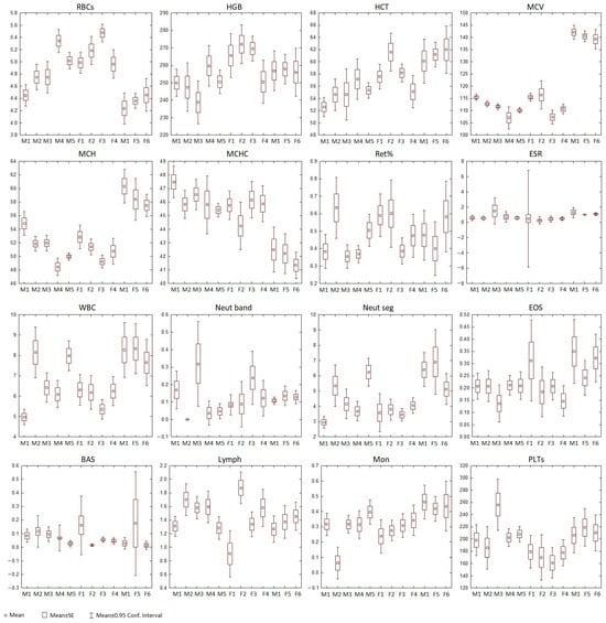 The concentrations of reticulocytes (Ret; %), total numbers of band neutrophils (Neut band; 109/L), segmented neutrophils (Neut seg; 109/L), eosinophils (Eos; 109/L), basophils (Bas; 109/L), monocytes (Mon; 109/L), and lymphocytes (Lymph; 109/L) were measured using a manual method. The Panchekov method was used to determine the erythrocyte sedimentation rate (ESR) [25].