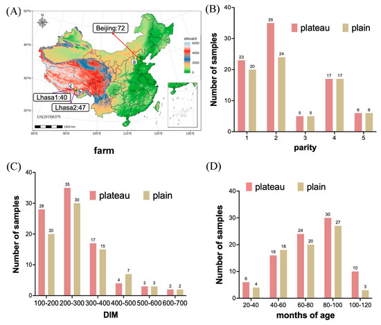 The characteristics of selected experimental animals. (A) a: seventy-two Holstein cows in the plain group from the Sanyuanluhe Treasure island in Beijing (latitude: 116.3503647; longitude: 39.54088527; altitude: 38 m), b: forty-seven in the plateau group from the Gaba ecological ranch in Lhasa (latitude: 91.24; longitude: 29.67; altitude: 3600 m), c: forty in the plateau group from the high-standard dairy cows breeding center in Lhasa (latitude: 91.26; longitude: 29.64; altitude: 3600 m). (B–D) Parities, DIM, and age in months of experimental animals.