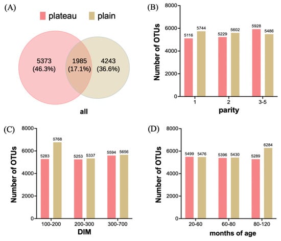To examine microbial differences between the plateau group and the plain group, we conducted an OTU cluster analysis. A total of 9,273,171 raw sequence reads were obtained from the 159 samples. After splicing, quality control, and chimera filtration, a total of 5,480,431 high-quality sequences were generated, and the average number of sequences per sample was 34,468.12. Then, OTUs with an absolute abundance of less than 20 were removed. A Venn diagram (Figure 2A) demonstrated the unique and shared OTUs between two groups; 5373 and 4243 OTUs were unique in the plateau group and plain group, respectively, and 1985 OTUs, accounting for 17.1% of the total OTUs, overlapped both in the plateau group and plain group. The unique OTUs in the plateau group are more than those in the plain group, and the OTUs shared by the two groups are less than the unique ones. Also, we undertook a rigorous analysis by grouping and quantifying OTU numbers based on key parameters, including parity, DIM, and age in months. Parity was reclassified into subsets (1, 2, and 3–5) to ensure consistent individual counts within each category, as illustrated in Figure 1B. Similarly, DIM was segmented into intervals (100–200, 200–300, and 300–700) based on the data in Figure 1C, while age in months was segmented into 20–60, 60–80, and 80–120, as shown in Figure 1D. The results revealed that OTU numbers increased with parity in the plateau group but decreased in the plain group (Figure 2B). Fluctuations in OTUs were observed across different DIMs and age-in-month segments within both groups (Figure 2C,D). Specifically, the plateau group displayed a higher OTU count than the plain group in the 100–200 DIM (Figure 2C) and 80–120 age-in-month segments (Figure 2D).