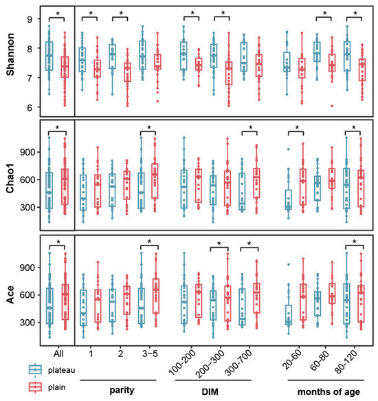 To characterize the hindgut bacteria between the plateau group and the plain group cows, DNA metabarcoding was used to target the bacterial species. For all samples, our analysis revealed significant differences in the Shannon, Chao1, and Ace diversity indices between the two groups (p < 0.05, respectively; Wilcoxon rank-sum test; Figure 3). Notably, the Shannon index was higher in the plateau group, while the Chao1 and Ace indices were higher in the plain group. Further examination unveiled significant distinctions in the Shannon and Chao1 indices for parities 1 and 2, as well as in the Chao1 and Ace indices for parity 3 (Figure 3, parity). Similarly, significant differences were observed in the Shannon index for the 100–200 DIM segment and in both Shannon and Ace indices for the 200–300 DIM segment. Additionally, differences in the Chao1 and Ace indices were noted for the 300–700 DIM segment (Figure 3, DIM). Also, significant variations were detected in the Chao1 index for the 20–60 month age group, the Shannon index for the 60–80 month age group, and all three indices (Shannon, Chao1, and Ace) for the 80–120 month age group (Figure 3, age in months).