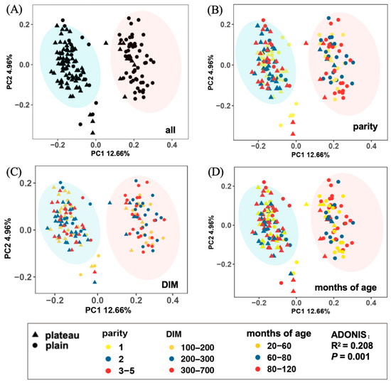 PCoA plot among microflora based on the abundance of OTUs in plateau and plain Holstein cows. (A) All cows in the plateau and plain groups. (B–D) Different parities, DIMs, and age in months of cows in the plateau and plain groups.