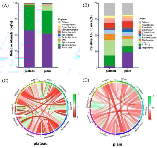 Conversely, in the plain group, Treponema (relative abundance > 4%, LDA > 4.0), Spirochaetaceae (relative abundance > 4%, LDA > 4.0), and Spirochaetes (relative abundance > 4%, LDA > 4.0) showed increased abundance. Moreover, all of these taxa fall under the Spirochaetes phylum, highlighting their prominent presence in the plain group. Additionally, Prevotella also exhibited increased abundance in the plain group (as illustrated in the LDA score in Figure 7). Moreover, Treponema and Prevotella exhibited significant differences in the microbial community structure between the two environments, as highlighted in Result 2.4. In the plain group, Treponema comprised 34.1% of the microbial composition, while Prevotella accounted for 9.72%. In stark contrast, the plateau group displayed markedly lower proportions, with Treponema constituting only 3.74% and Prevotella 2.78% (see Table 1). Notably, the interactions between these two genera also varied between the two groups, as illustrated in Figure 5C,D. Prevotella also demonstrated a strong role in fostering interactions with other microorganisms, as evidenced by co-occurrence network analysis, where it was involved in the first module and achieved a degree of 81 (as shown in Table 2) in the plain group, but such interactions were not observed in the plateau group.