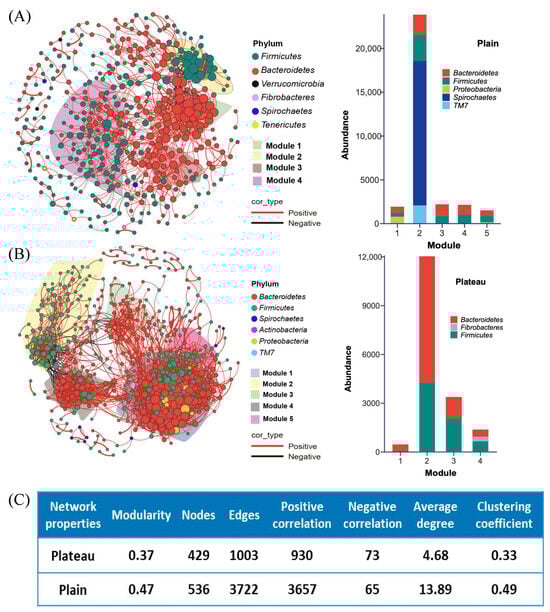 Furthermore, the OTUs with a relative abundance of > 0.01% from plateau Holstein cows (1648) and plain Holstein cows (2011) were used to construct an ecological network of bacterial communities (FDR-adjusted p-value < 0.001, R > 0.7), with the results presented in Figure 6A,B. A total of 429 and 536 nodes, 1003 and 3722 edges, including 93% and 98% positive correlations of the ecological network, were obtained for plateau and plain group cows, respectively (Figure 6C). And, the betweenness_centrality of the network was 579 in the plateau and 696 in the plain group. The closeness_centrality of the network was 0.18 in the plateau and 0.07 in the plain group. The ecological network of the bacterial community in plain group cows had more links (with 13.89 average degrees) than in plateau group cows (with 4.68 average degrees and fewer nodes). On the other hand, the former (with a 0.47 modularity index and five modules) was better modularized than in plateau group cows (with a 0.37 modularity index and four modules, Figure 6C). Module analysis of the networks revealed four main modules in the plateau group (with a 0.33 clustering_coefficient) and five main modules in the plain group (with a 0.48 clustering_coefficient). Firmicutes, Bacteroidetese, Verrucomicrobia, Fibrobacleres, Spirochaetes, and Tenericutes dominated in all modules of an ecological network in plateau group cows (Figure 6A). For plain group cows, Bacteroidetes, Firmicutes, Spirochaetes, Actinobacteria, Proteobacteria, and TM7 dominated in all modules (Figure 6B). So, the network observed in the plain group appeared more intricate and interconnected than the plateau group, indicating a higher level of interactions within the bacterial community, irrespective of taxonomic classification. Upon the OTUs representing microbial taxa in each node, distinct taxonomic profiles were observed. In the plateau group, the top four modules exhibited lower taxonomic diversity and were predominantly composed of Bacteroidetes, Fibrobacteres, and Firmicutes. While in the plain group, module2 displayed higher diversity and was dominated by Bacteroidetes, Firmicutes, Spirochaetes, and TM7, while module1, module3, module4, and module5 showed lower diversity with the dominance of Bacteroidetes, Firmicutes, or Proteobacteria. Also, the top three nodes (key nodes) exhibiting strong interactions with other nodes within different network modules in both the plateau and plain groups are listed in Table 3.
