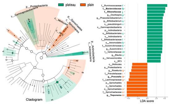 A linear discriminant analysis effect size (LEfSe) test was performed to assess the statistical differences in microbial communities between the plateau and plain groups. A total of 30 differentially abundant taxa with LDA > 2 were identified at six different taxonomic levels, from phylum to species, as illustrated in the cladogram presented in Figure 7. In the plateau group, three families stood out due to their relative abundance and significance: Ruminococcaceae (relative abundance > 27%, LDA > 4.0), Bacteroidaceae (relative abundance > 5%, LDA > 4.0), and Rikenellaceae (relative abundance > 3%, LDA > 3.5). Moreover, both Bacteroidaceae in the third module and Rikenellaceae in the first module were exclusive to the plateau group and ranked among the top thirty bacteria with strong interactions with other microorganisms, demonstrating degrees of interaction of 15 and 12, respectively, as shown in Figure 6A and detailed in Table 2 in co-occurrence network analysis.