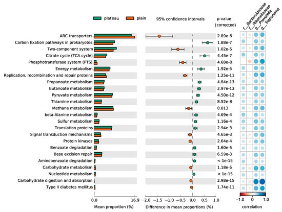 PICRUSt2-predicted KEGG function between the plateau and plain Holstein cows and correlation analysis with four key microorganisms. The map contains two parts. Error bar plots were generated to compare the two groups using Welch’s t-test on PICRUSt2-predicted KEGG function data. Bar graphs with extended error bars displayed only predicted functions with p < 0.05. The bar plots on the left represent the average proportion of each KEGG pathway, while the dotted plots on the right illustrate the differences in average proportions between the two groups (left part of the panel). Correlation analysis in four key bacterium and pathways. Blue designates a positive correlation while red designates a negative correlation (right part of the panel).