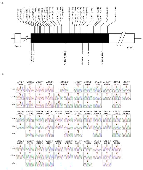 The electropherograms of amplicon sequencing results were analyzed using Finch TV software Ver. 1.4.0 (Geospiza Inc, Seattle, WA, USA), and genotyping was performed using ApE software https://jorgensen.biology.utah.edu/wayned/ape/ (accessed on 11 July 2023) to identify genetic polymorphisms. Genotyping was confirmed using both forward and reverse primers, and only files with a Q > 30 value were utilized for analysis. Quality control (QC) procedures were conducted based on the Hardy–Weinberg Equilibrium.