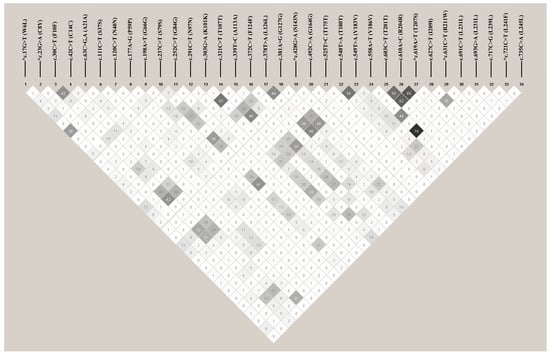 The linkage disequilibrium (LD) block structure consisting of 34 SNPs located in the frog PRNP gene. The coefficient of the LD (r2 value) between the SNPs was calculated by HaploView Ver. 4.2 software. The LD color scale ranges from white to black, with an increasing color intensity corresponding to higher r² values.