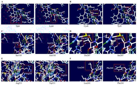 The analysis of the hydrogen bond alterations in the frog prion protein (PrP) according to 6 non-synonymous SNPs was evaluated using Swiss-Pdb Viewer Ver. 4.1.0 software. (A) The 3D structure of frog PrP with Trp6 and Leu6 alleles. (B) The 3D structure of frog PrP with Cys8 and Tyr8 alleles. (C) The 3D structure of frog PrP with Ser143 and Asn143 alleles. (D) The 3D structure of frog PrP with Thr207 and Ser207 alleles. (E) The 3D structure of frog PrP with Arg211 and Trp211 alleles. (F) The 3D structure of frog PrP with Leu241 and Phe241 alleles. The red box indicates the functional groups of the target amino acid. The green and gray dotted lines indicate hydrogen bonds. The green and gray numbers indicate the length of the hydrogen bond. The orange arrow indicates the region where the hydrogen bond length changed.