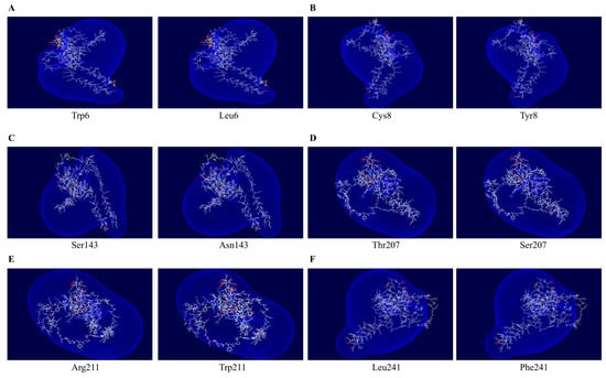 The electrostatic potential prediction of frog PrP according to six non-synonymous SNPs. (A) The electrostatic potential of frog PrP with Trp6 and Leu6 alleles. (B) The electrostatic potential of frog PrP with Cys8 and Tyr8 alleles. (C) The electrostatic potential of frog PrP with Ser143 and Asn143 alleles. (D) The electrostatic potential of frog PrP with Thr207 and Ser207 alleles. (E) The electrostatic potential of frog PrP with Arg211 and Trp211 alleles. (F) The electrostatic potential of frog PrP with Leu241 and Phe241 alleles. The color of the molecular surface indicates the electrostatic potential: blue: positive potential; red: negative potential.