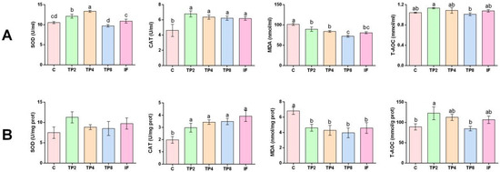 The activity of liver SOD did not significantly differ among the groups (Figure 1B). The activity of CAT in the TP2, TP4, TP8, and IF groups was significantly greater than in the control group (p < 0.05) (Figure 1B). The MDA content in the four experimental groups was significantly lower than in the control group, with the lowest value occurring in the TP8 group (p < 0.05) (Figure 1B). The T-AOC level in the TP2 group was significantly greater than in the C and TP8 groups (p < 0.05) (Figure 1B). Moreover, the SOD activity levels in TP2, TP4, TP8, and IF were on average higher than in the remaining groups, albeit the difference was not statistically notable (p > 0.05) (Figure 1B).