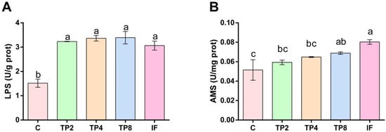 The midgut LPS activity was two times greater in the four experimental groups than in the control group (p < 0.05) (Figure 2A). AMS activity generally rose with higher dietary TP levels, showing significant increases in the TP8 and IF groups compared with the C group (p < 0.05) (Figure 2B).