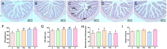 Intestinal tissue morphology of largemouth bass fed the five experimental diets. (A–E) C, TP2, TP4, TP8, and IF (100X), respectively. VH (villi height); VW (villi width); MT (muscular layer thickness); GC (goblet cell). (F–I) Villus height, villus width, muscular layer thickness and goblet cell number, respectively. Different letters indicate significant differences (p < 0.05), and the same letter or no letter indicates no significant differences (p > 0.05).