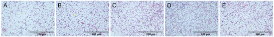 Hematoxylin–eosin-stained liver sections from largemouth bass fed the five experimental diets. Figures (A–E) represent groups C, TP2, TP4, TP8, and IF (200×), respectively. The red arrows represent congestion; the black arrows represent off-center hepatocyte nuclei, and the yellow arrows represent lipid vacuoles.