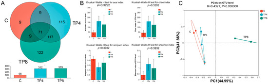 According to the Venn diagram, the TP8 group had the greatest number of intestinal microbial OTUs, whereas the control group had the lowest number of OTUs (Figure 5A). The C, TP4, and TP8 groups contained 9, 115, and 122 unique OTUs, respectively. Additionally, the three groups shared a total of 71 OTUs. The TP4 group exhibited the highest averages for the Shannon, Chao, and Ace indices, yet the disparities were not statistically significant (p > 0.05) (Figure 5B).