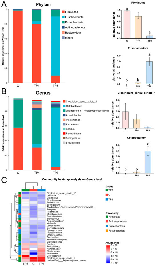 At the phylum level, Firmicutes was the most abundant phylum in both the C and TP4 groups (98.24%, 79.60%), which was significantly greater than in the TP8 group (9.79%) (p < 0.05), whereas Fusobacteriota was the most abundant phylum in the TP8 group (80.43%) (p < 0.05) (Figure 6A). In terms of genus, the dominant species within the gut microbiome were primarily Clostridium_sensu_stricto_1, Cetobacterium, and unclassified_f_Peptostreptococcaceae. Notably, the relative abundance of Cetobacterium was notably greater in the TP8 group (80.43%) compared to the C and TP4 groups (0.18%, 4.48%) (p < 0.05). Although the relative abundance of unclassified_f_Peptostreptococcaceae was lower (9.79%), the differences were not statistically significant (p > 0.05) (Figure 6B).
