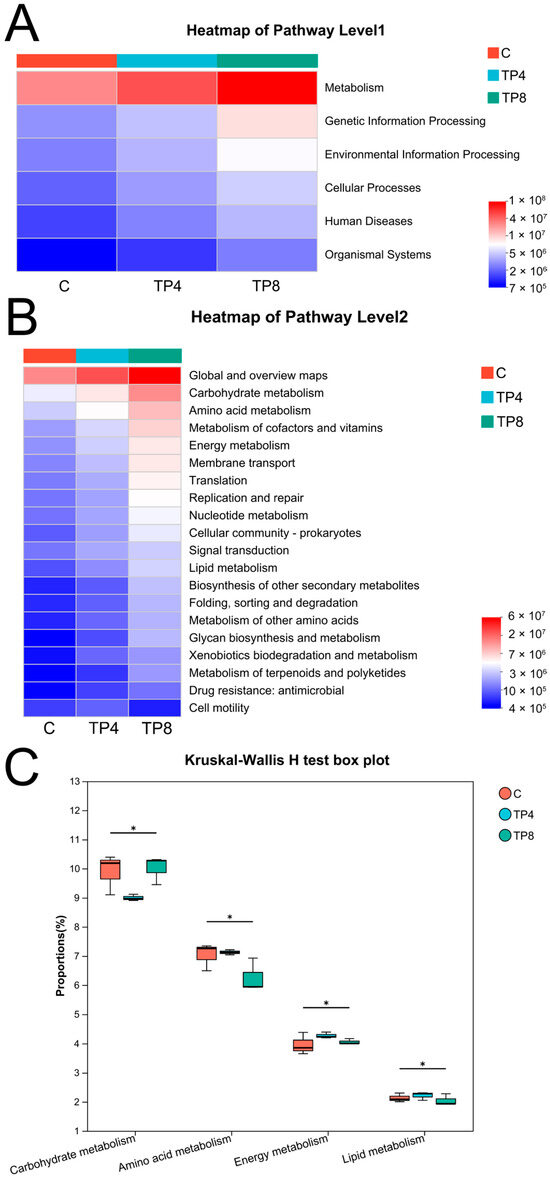 KEGG metabolic pathway analysis revealed that the gut microorganisms of the largemouth bass were primarily involved in metabolism, followed by genetic information processing and environmental information processing (Figure 7A). The results of the Kruskal–Wallis H test revealed that 18 of the top 20 KEGG functional pathways were significantly different between the C and TP8 groups (p < 0.05) (Figure 7B and Figure S1). Specifically, significant variations were detected in metabolic pathways, including carbohydrate metabolism, amino acid metabolism, energy metabolism, and lipid metabolism (p < 0.05) (Figure 7C).