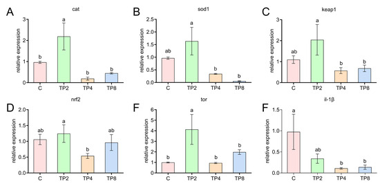 The mRNA levels of antioxidant- and immune-related genes in the C, TP2, TP4, and TP8 groups are shown in Figure 8. In the liver, the mRNA levels of Keap1, Nrf2, CAT, SOD1, and TOR in the TP2 group were significantly greater than those in the other groups (p < 0.05). However, the mRNA levels of IL-1β in the TP4 and TP8 groups were significantly lower than those in the control group (p < 0.05).
