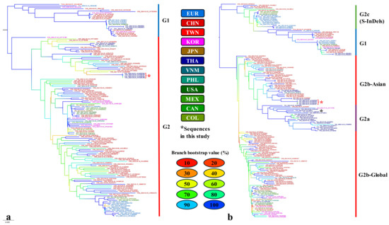 A total of 148 sequences were selected as representatives for the full-length genome dataset, while 21 additional sequences were included in the spike gene dataset (Table S2). Phylogenetic trees were constructed and are displayed in Figure 1, with bootstrap values used for branch labeling. According to IQ-TREE analysis, the spike gene data suggest that genogroup 2 can be further divided into four clusters: G2a, G2b-Asian, G2b-Global, and G2c (or S-InDels).