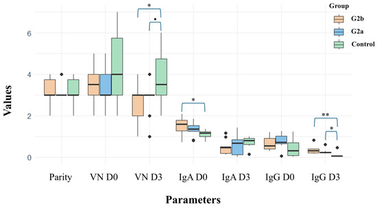 The parity, geometric mean titer (GMT) of the viral neutralization activity of colostrum and milk of sows at 0 (VN D0) and 3 (VN D3) days post-farrowing (DPF), the S/P ratio of immunoglobulin A (IgA) at 0 (IgA D0) and 3 (IgA D3) DPF, and immunoglobulin G (IgG) at 0 (IgG D0) and 3 (IgG D3) DPF of the colostrum and milk of sows. Orange, blue, and green colors represent samples from G2b-affected (G2b), G2a-affected (G2a), and negative status (control) sows, respectively. The range of p-values is indicated by asterisks (*** for 0–0.001, ** for 0.001–0.01, and * for 0.01–0.05) and small dots (0.05–0.1), above the brackets, which denote significant differences between groups. Black dots represent outlier data in the boxplot.