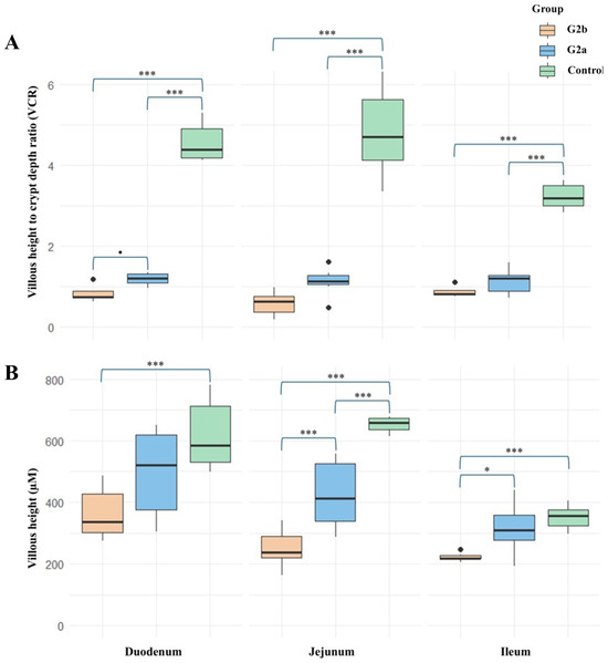 (A) The villous-height-to-crypt-depth ratio (VCR) and (B) villous length of piglets’ duodenum, jejunum, and ileum were determined using histopathology of the intestinal segments. The range of p-values is indicated by asterisks (*** for 0–0.001, ** for 0.001–0.01, and * for 0.01–0.05) and small dots (0.05–0.1), which denote significant differences between the affected piglets. Black dots represent outlier data in the boxplot.