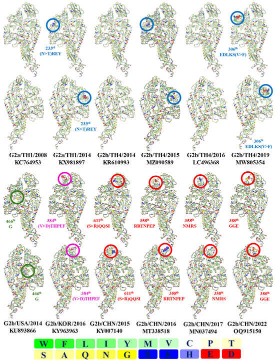 The protein structures of NPPED (G2a/TH1/2008; KC764953), VCF with insertion (G2a/TH1/2014; KX981897), CBR1 (G2b/TH4/2014; KR610993), C9822-GEN (G2b/TH4/2015), BP-2016 (G2b/TH4/2016; LC496368), and DTI1 (G2b/TH/2019; MW805354) from Thailand are compared to the predicted spike structures from other regions with insertions, including PC22A-P50 (G2b/USA/2014; KU893866), KNU-1601 (G2b/KOR/2016; KY963963), LNsy (G2b/CHN/2015; KY007140), HNAY2016 (G2b/CHN/2016; MT338518), WHLL (G2b/CHN/2017; MN037494), and ZJ2022 (G2b/CHN/2022; OQ915150). These structures were predicted using SWISS-MODEL and visualized with the Wimley–White Hydrophobicity Scale in iCn3D (v3.40.0). The color chart on the right-hand side indicates the residues based on the hydrophobicity scale. The blue, green, pink, and red circles highlight the amino acid insertion sites in the representative structure, corresponding to the insertions in Thailand, the US, South Korea, and China, respectively.