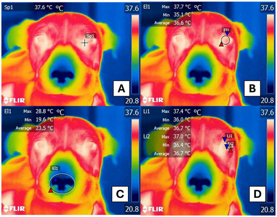 Thermal windows traced on radiometric images in female dogs. (A). Lacrimal gland window. A focal point (Sp1) was used at the medial canthus of the eyelids. (B). Ocular thermal window. A circle of approximately 2 cm in diameter (El1) was used to encompass both the upper and lower eyelids. (C). Nasal thermal window. A circle of 2.5 cm in diameter (El1) was used to encompass both nostrils. (D). Eyelid thermal window. A line of 4 cm in length was used to encompass the outer corner of both the lower eyelid (Li2) and the upper eyelid (Li1). Red triangles: maximum temperatures; blue triangles: minimum temperatures.